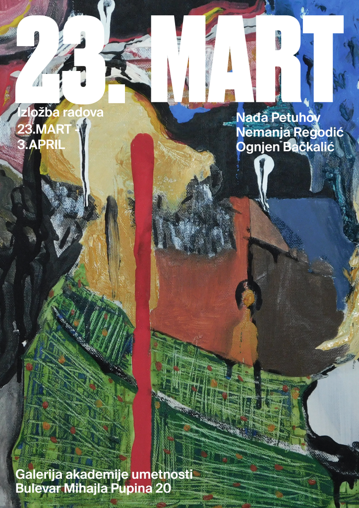 Izložba pod nazivom „23. MART“ biće otvorena u ponedeljak 23. marta 2026. u Galeriji Akademije umetnosti sa početkom u 19 časova.