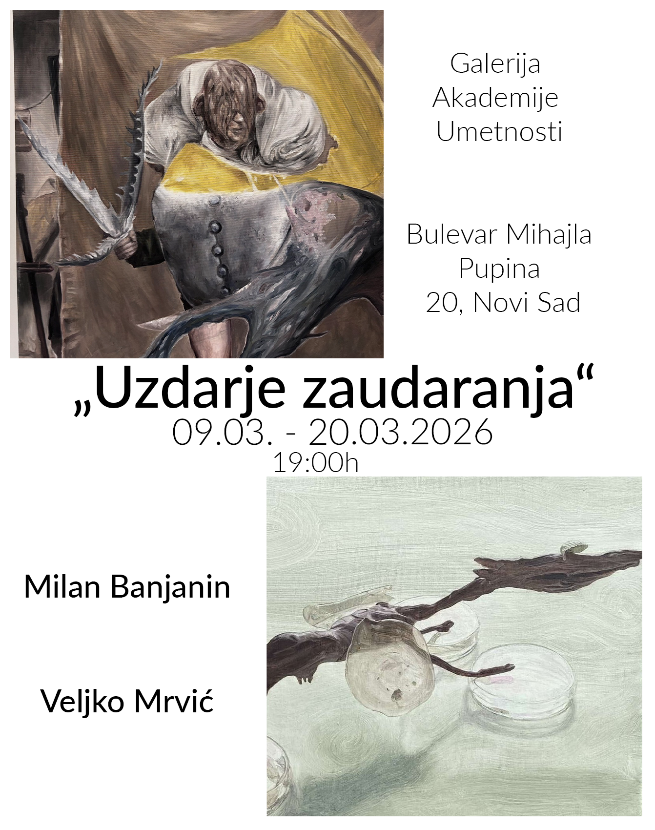 Pozivamo vas na otvaranje izložbe UZDARJE ZAUDARANJA, Milana Banjanina i Veljka Mrvića, u ponedeljak 9. marta, u 19 časova.
