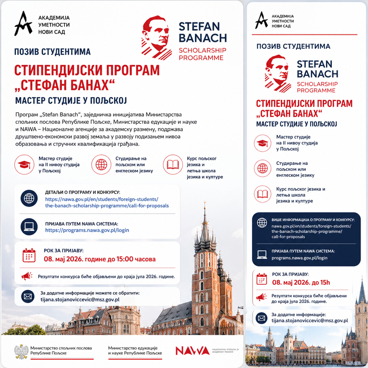 Akademija umetnosti Univerziteta u Novom Sadu obaveštava studente o otvorenom pozivu za učešće u prestižnom stipendijskom programu „Stefan Banach“, koji realizuju Ministarstvo spoljnih poslova Republike Poljske, Ministarstvo edukacije i nauke i NAWA – Nacionalna agencija za akademsku razmenu.